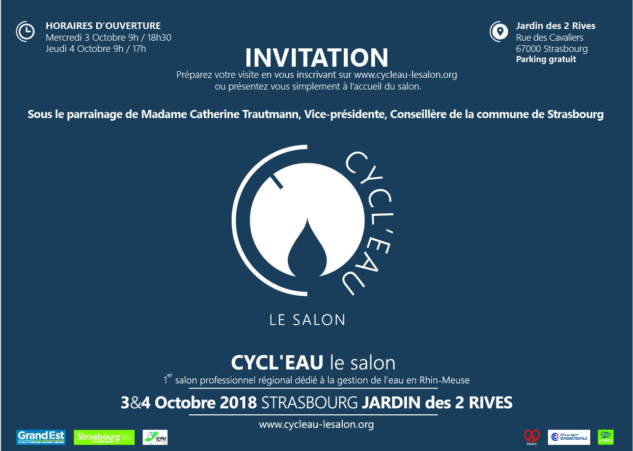 Les 3 et 4 octobre 2018, Strasbourg accueillera, au Jardin des 2 Rives, le salon professionnel CYCL’EAU pour 2 jours d’échanges consacrés à la gestion de l’eau au coeur du bassin Rhin-Meuse.